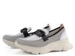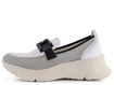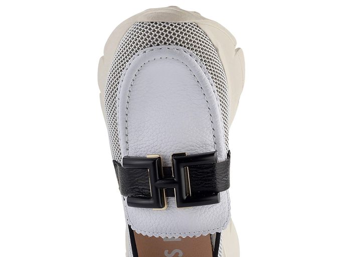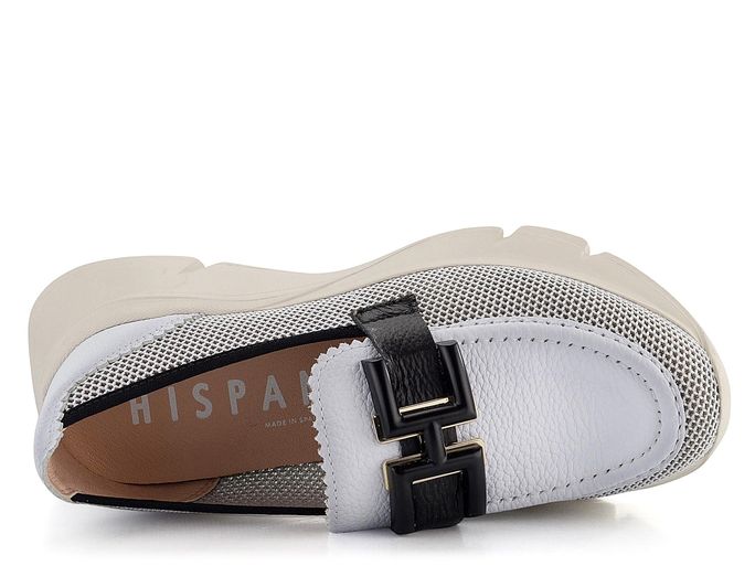 Módní styl dámských mokasín se sportovním nádechem od značky Hispanitas přináší lehkost a komfort. Svršek je kombinací strukturované kůže a prodyšné síťované textilie, což zajišťuje skvělou ventilaci a pohodlí. Mokasíny vynikají bílou barvou s černými doplňky, kde bílé kožené části jsou jemně stínované do šeda. Na nártu je ozdobná aplikace z kovu a plastu v černo-zlaté barvě, která dodává botám elegantní vzhled.