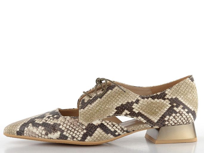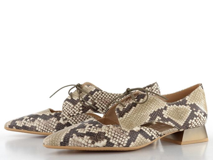 Vyzkoušejte luxusní dámské polobotky od značky Hispanitas, které v sobě kombinují španělský šmrnc a jedinečný design. Tyto polobotky jsou vyrobeny z poddajné kůže s hadinkovou strukturou, která dodává botám elegantní vzhled v tónech hnědé a béžové. Špičatý střih a vzdušné provedení s prostřihy na bocích a nártu zajišťují styl a pohodlí zároveň. Boty jsou vybaveny měkkou stélkou s technologií TRIFLOW®, která poskytuje pocit chůze jako na gelovém polštářku. Široký podpatek s výškou 2,6 cm dodává stabilitu a elegantní vzhled. Ideální volba pro ženy, které hledají kvalitu a komfort v jednom.
