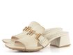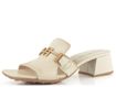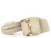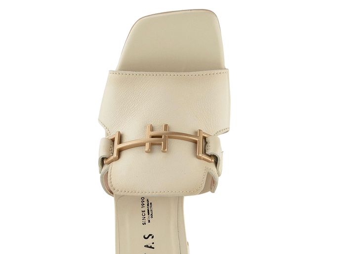 Výjimečné dámské kožené pantofle v krémové barvě, ozdobnou aplikací a širokým podpatkem.