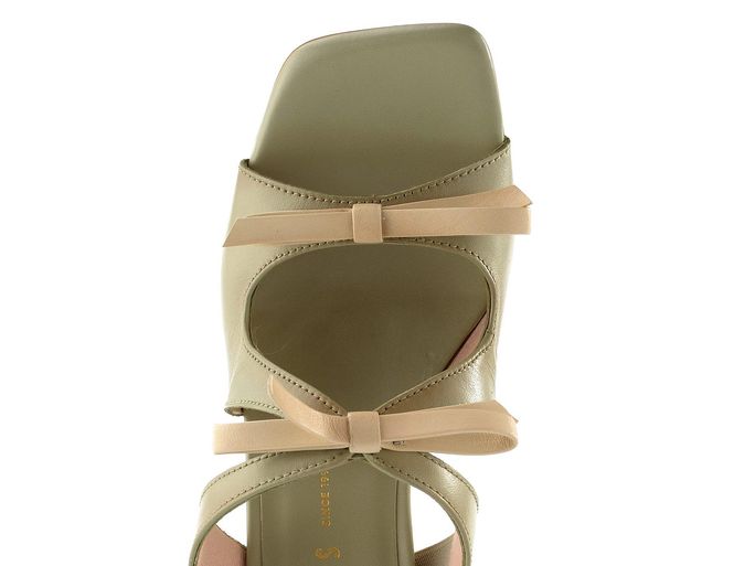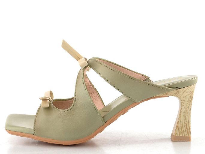 Luxusní dámské pantofle na podpatku od značky Hispanitas jsou ideální volbou pro jarní a letní dny. Tyto pantofle v trendy karé střihu jsou vyrobeny z hladké kůže v světlé šedozelené barvě, která skvěle doplní váš outfit. Dvě ozdobné mašličky na nártu v béžové barvě dodávají obuvi šarm a eleganci.