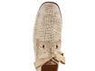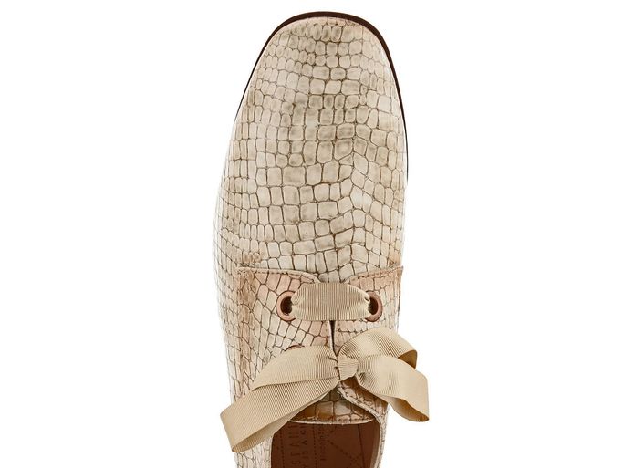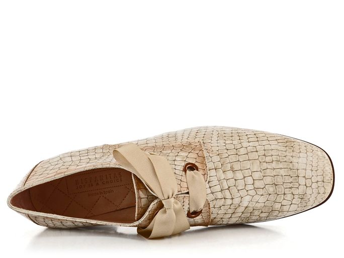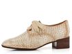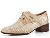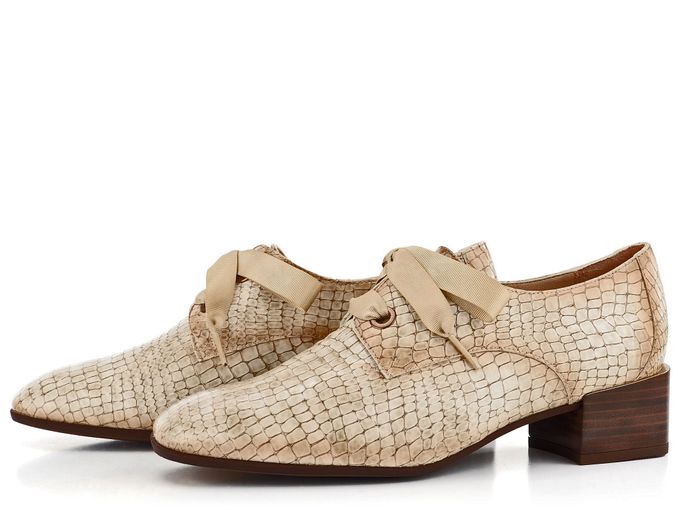 Exkluzivní dámské polobotky na podpatku z lakované kůže s hadinkovým vzorem v krémové barvě.