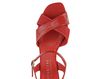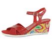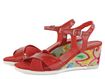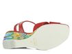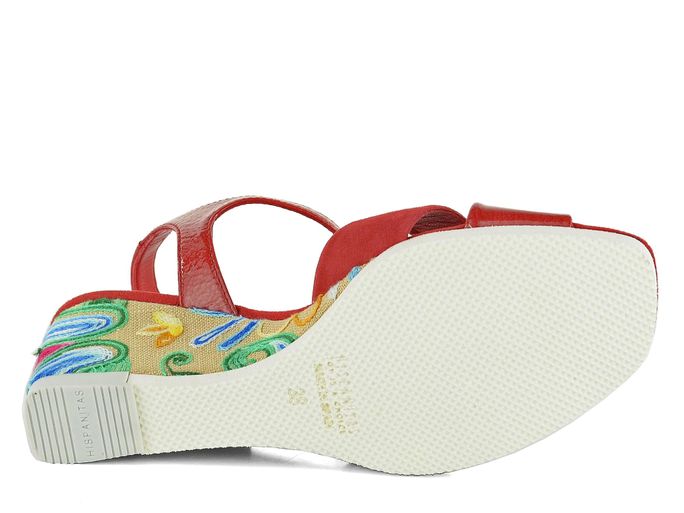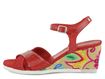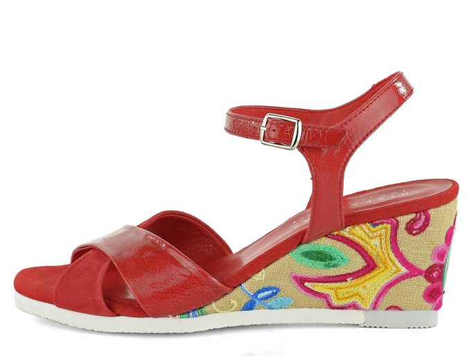 Dámské sandály na klínu s barevnou výšivkou ve smyslném červeném provedení.