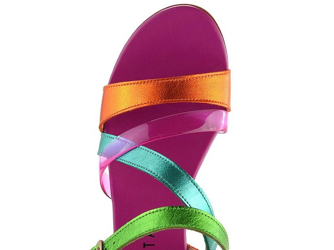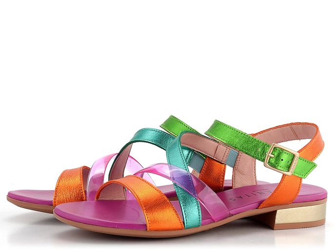 Luxusní dámské sandály z metalické kůže v barevném provedení, s měkkou stélkou a nízkým podpatkem.