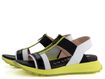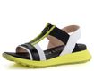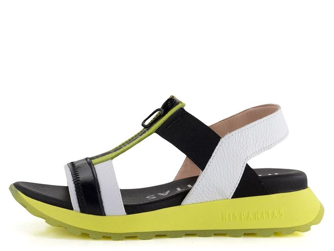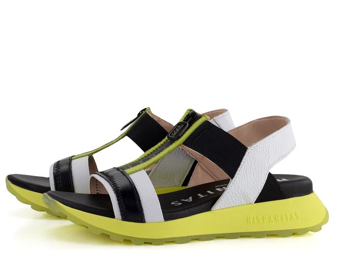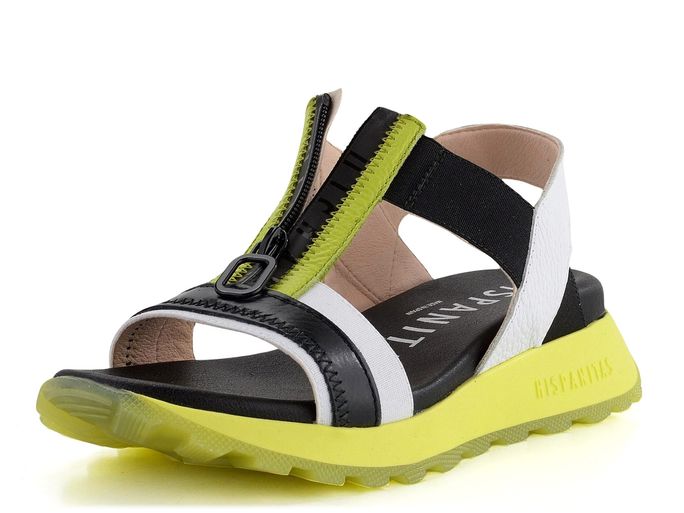 Dámské módní sandály na platformě od španělské značky Hispanitas jsou ideální volbou pro jarní a letní sezónu. Tyto sandály kombinují strukturovanou kůži s textilií v elegantních barvách – černé, bílé a světle zelené s akcenty žlutozelené barvy kiwi. Komfortní střih s kulatou špičkou a funkční zip na nártu krytý gumovou légou zajišťují snadné obouvání a dokonalé padnutí díky pruženkám na nártovém pásku.