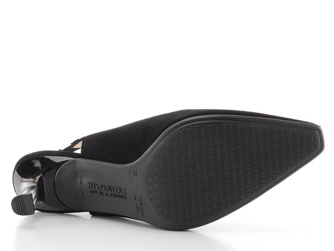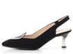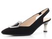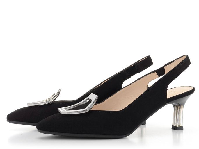 Dámské lodičky z koženého semiše mají volnou patu a sladěné doplňky v podobě šestiúhelníkové spony a módního podpatku.