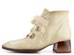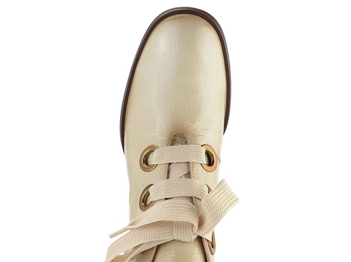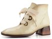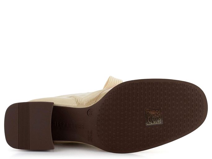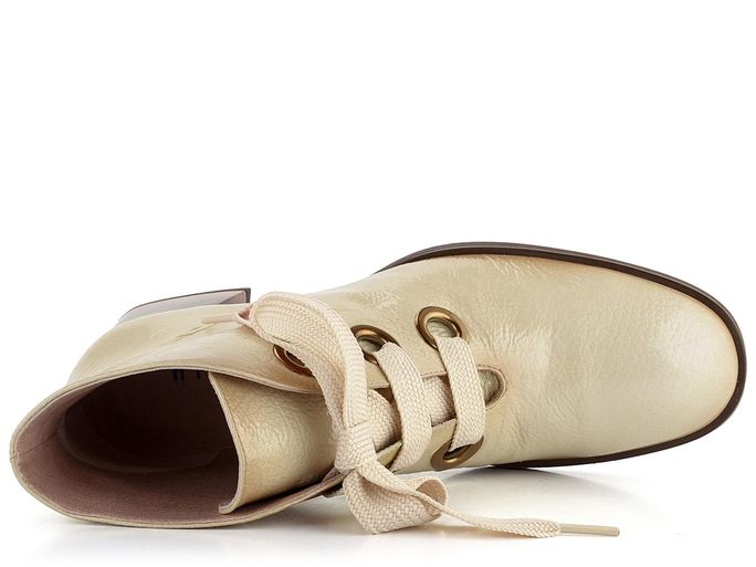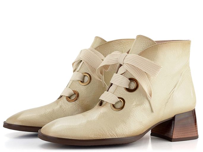 Elegantní béžový kotník na podpatku, se svrškem z lakované kůže doplněné nápadným provazováním.