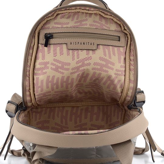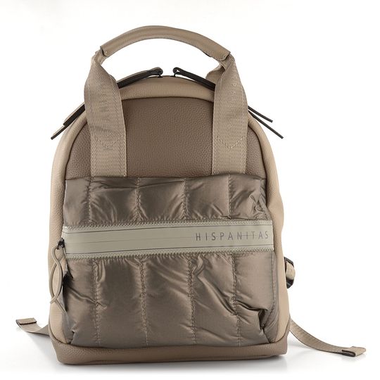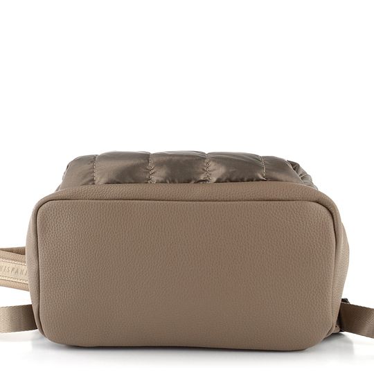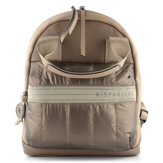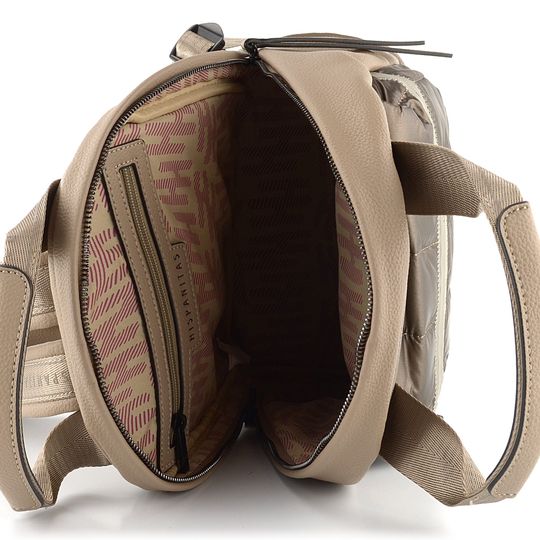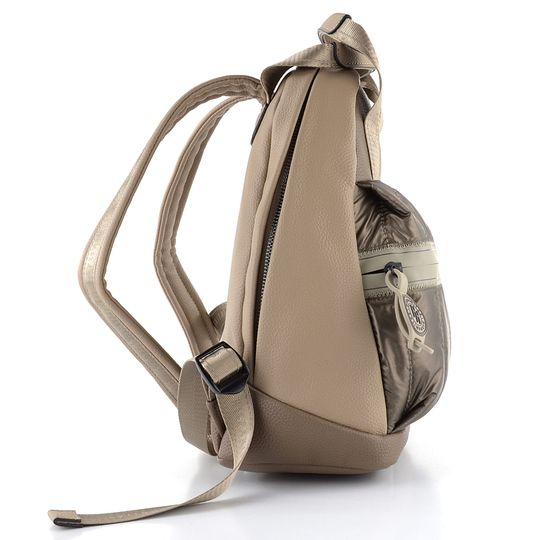 Dámský batoh ve sportovním střihu, v originální barevné kombinaci doplněný lesklou a prošívanou šusťákovinou na přední straně.
