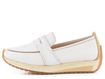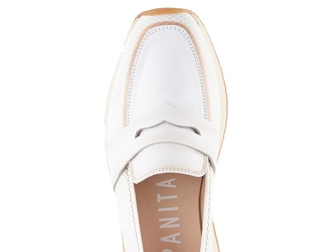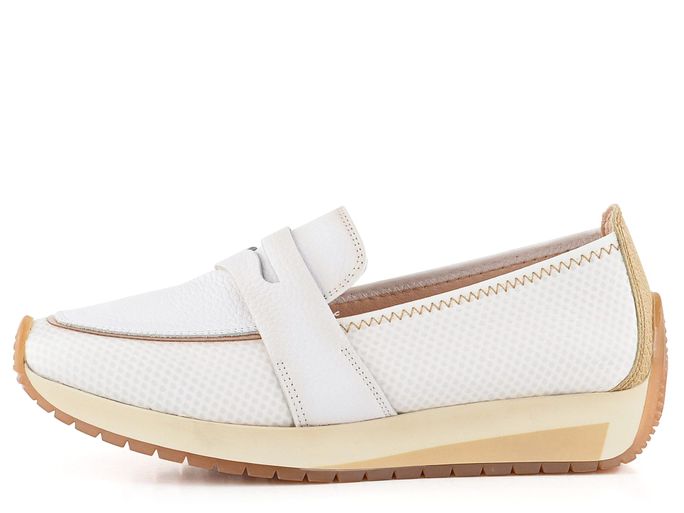 Objevte módní styl dámských mokasín s trendy sportovním šmrncem od značky Hispanitas. Tyto mokasíny nabízejí komfortní střih s prostornou špičkou a svršek tvořený strukturovanou kůží a textilií. Sněhově bílá barva je doplněná krémovými a béžovými tóny, což dodává elegantní vzhled. Nárt zdobí vykrajovaný pásek a lem z pružné paspulky se přizpůsobí tvaru nohy. Podšívka je z netkané textilie a vyjímatelná stélka má pěnový základ. Díky technologii TRIFLOW® s třemi polstrovanými vrstvami ve stélce a podešvi, je chůze jako na gelovém polštářku, což poskytuje výjimečné odpružení pro celodenní pohodlí. Zvýšená podešev s latexovým nášlapem a ochranou paty a špičky zajišťuje dlouhou životnost. Tyto mokasíny jsou ideální volbou pro ženy, které hledají stylovou a pohodlnou obuv na jaro a léto.