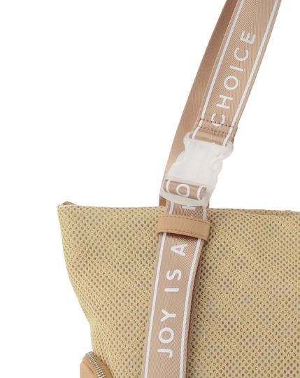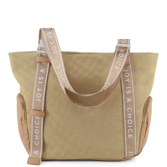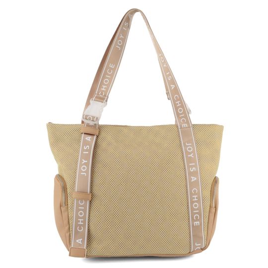 Dámská velká kabelka ve sportovním střihu s módně potištěnými prvky a se zajímavě řešenými popruhy s plastovými sponami.
