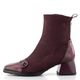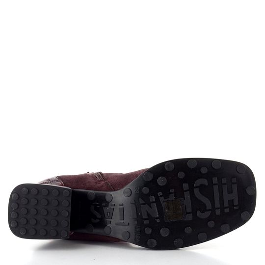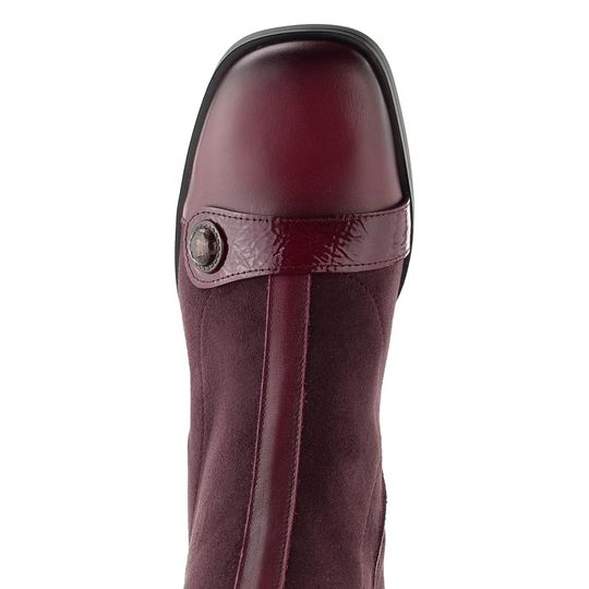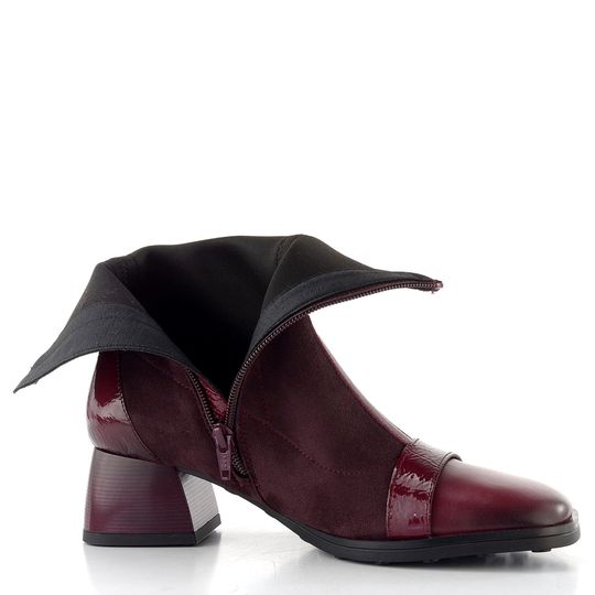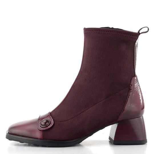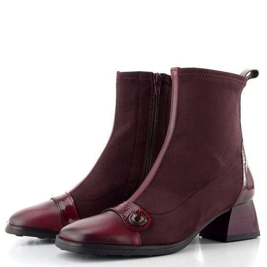 Luxusní dámský kotník od značky Hispanitas spojuje styl a komfort v jednom. Vyrobený z pružné broušené textilie a hladké lakované kůže, tento model v vínové barvě s nádechem do bordó přináší jedinečný vzhled. Prostorná hranatější špička a ozdobný pásek s nýtem dodávají botám šmrnc, zatímco zip na vnitřní straně usnadňuje obutí.