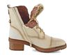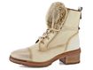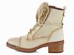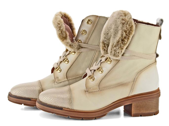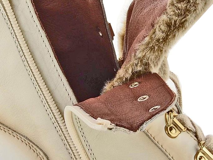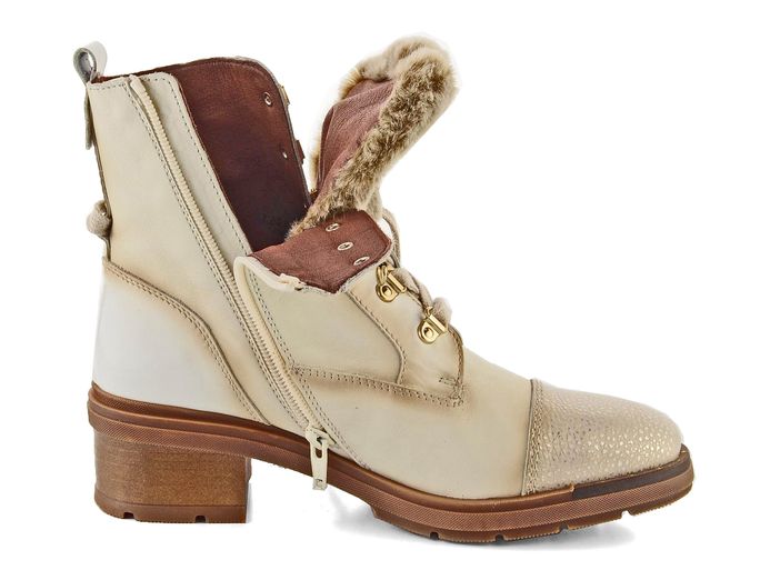 Dámská nevyteplená kotníčková obuv ve slonovinovém odstínu s kožešinkou v horní části jazyku a s nižším podpatkem.