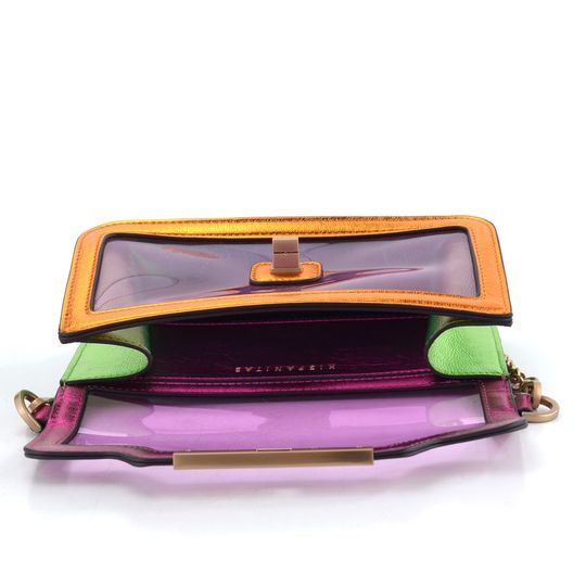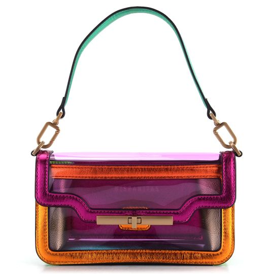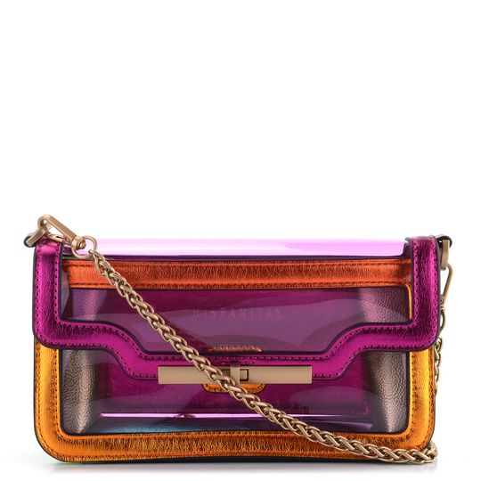 Nepřehlédnutelná malá crossbody kabelka v transparentním provedení se stane vaším stylovým doplňkem na jaro a léto. Tato kabelka od značky Hispanitas zaujme jedinečnou kombinací fuchsiově růžové, oranžové, světle zelené a zelenomodré barvy, což jí dodává výrazný a moderní vzhled. Vyrobena je z metalické syntetiky a slídy, což zajišťuje její lehkost a odolnost.