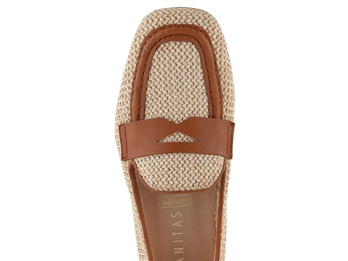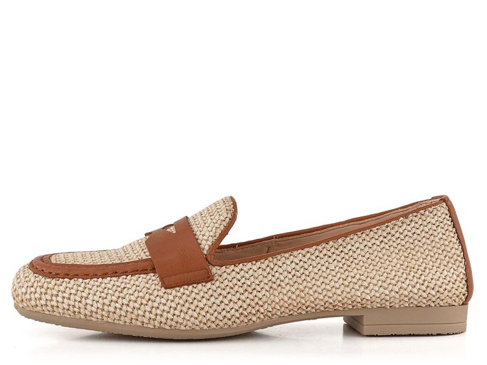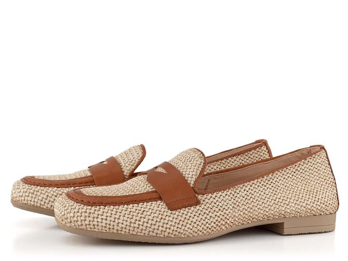 Luxusní dámské mokasíny v béžové barvě, vyrobené z proplétaného materiálu.