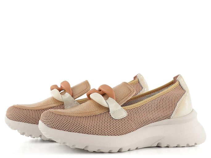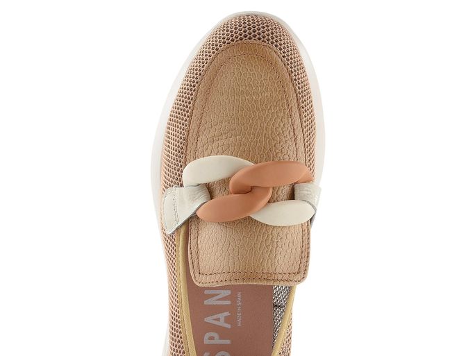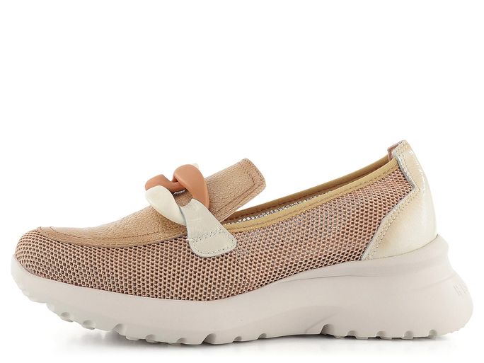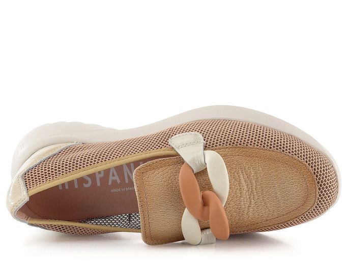 Módní styl dámských mokasín od značky Hispanitas přináší svěží sportovní šmrnc do vašeho šatníku. Tyto boty jsou ideální na jaro a léto, nabízejí lehkost a komfort díky prostorné špičce. Svršek je vyroben z strukturované kůže a prodyšné síťované textilie v přírodní béžové barvě, která dodává botám elegantní vzhled. Trendy plastový řetěz na nártu a pružná paspulka zajišťují moderní vzhled a přizpůsobení tvaru nohy. Díky technologii TRIFLOW® s třemi polstrovanými vrstvami ve stélce poskytují mokasíny chůzi jako na gelovém polštářku, což zaručuje celodenní pohodlí. Zpevněná lakovaná pata a módní vyšší podešev v lehkém provedení podtrhují jejich jedinečnost. Lepený výrobní způsob zajišťuje trvanlivost a kvalitu. Tyto mokasíny jsou skvělou volbou pro každou ženu, která hledá stylovou a pohodlnou obuv pro každodenní nošení.