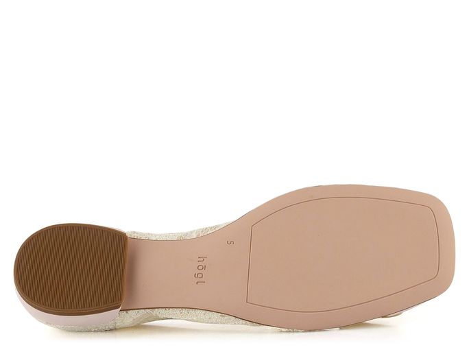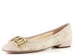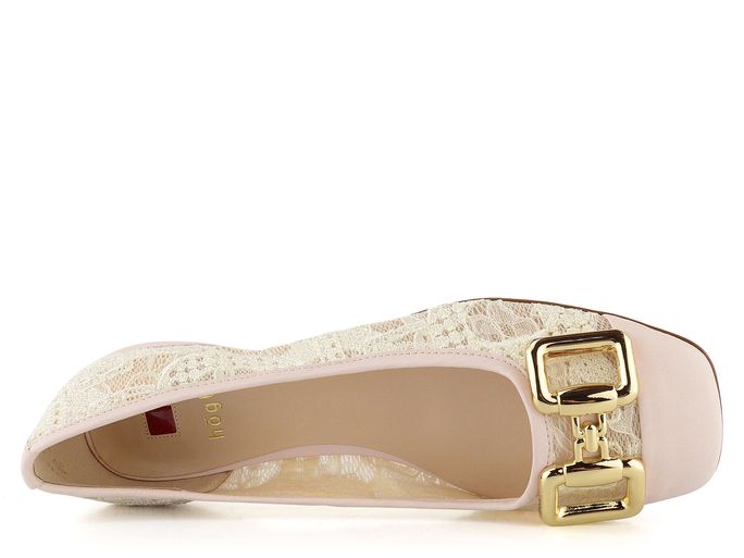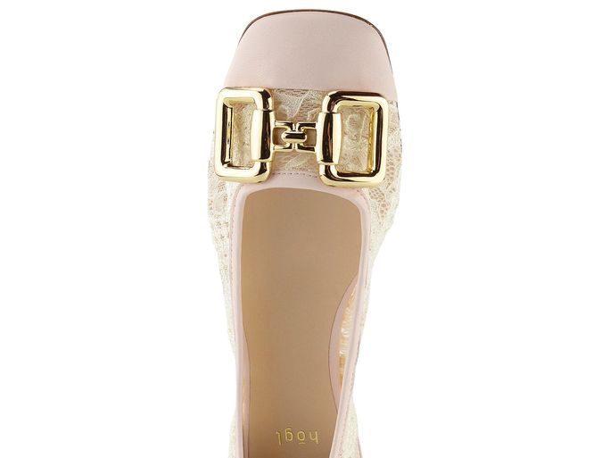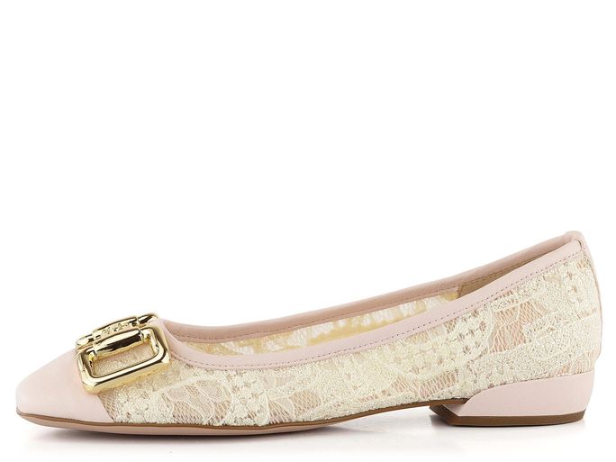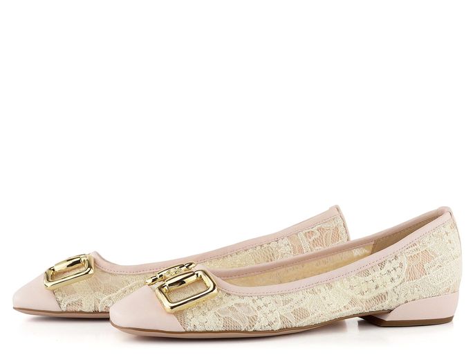 Půvabné dámské balerínky z průsvitné krajky v růžovo-béžové barevné kombinaci s kovovou sponou na špičce.