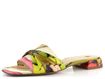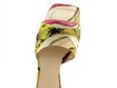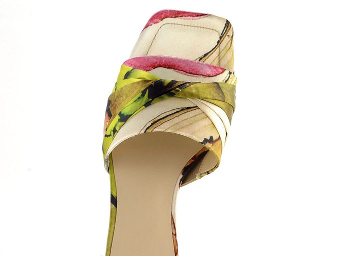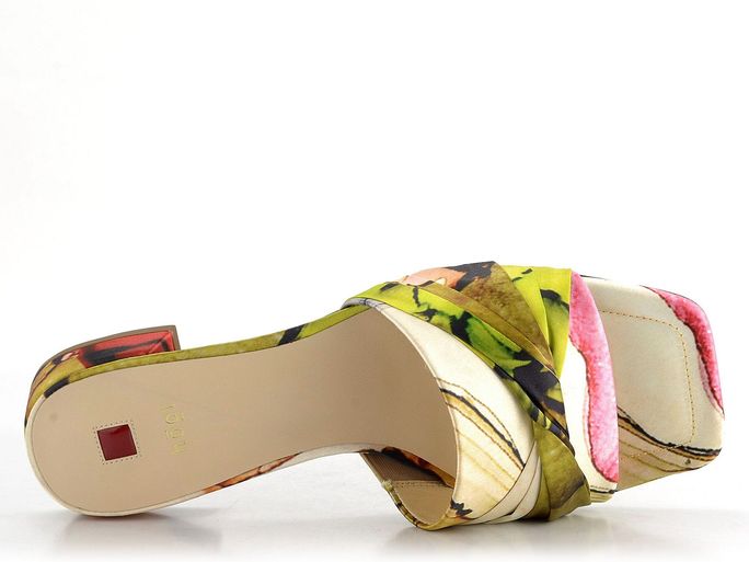 Dámské pestrobarevné pantofle z hedvábné tkaniny a s nízkým pohodlným podpatkem.