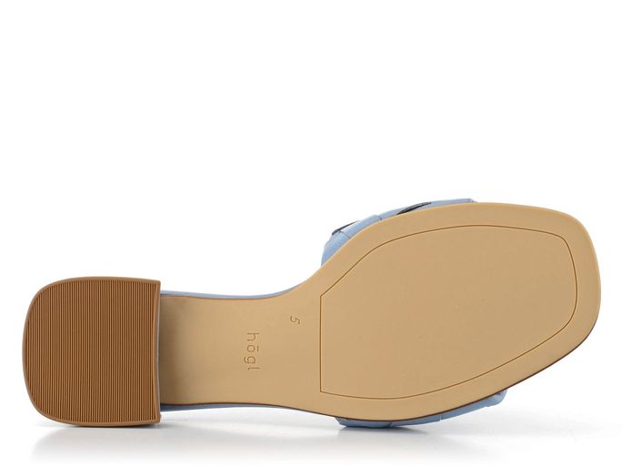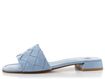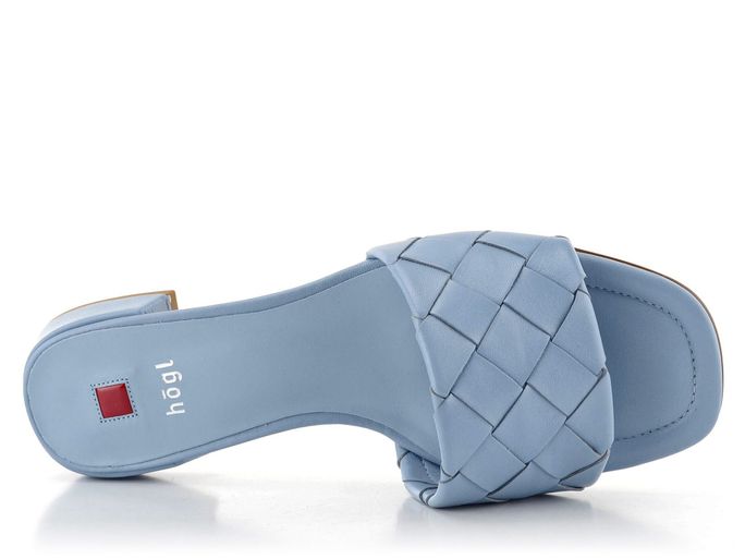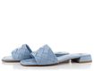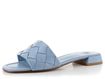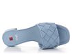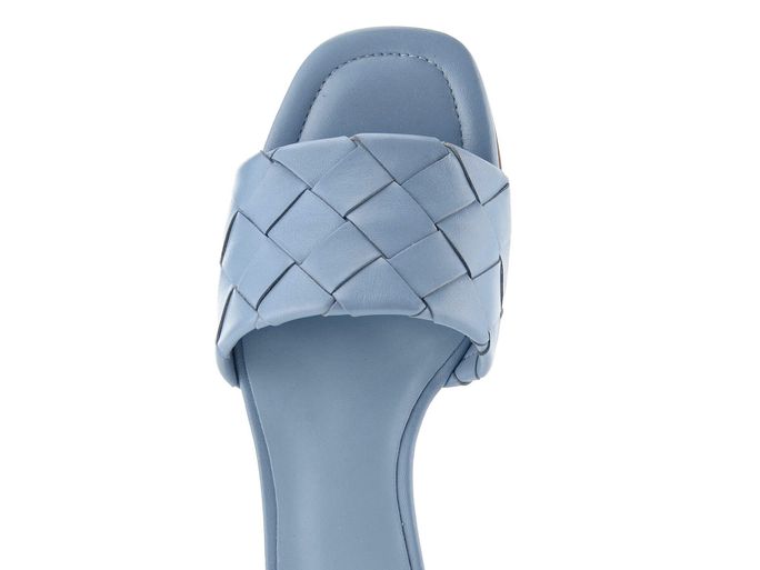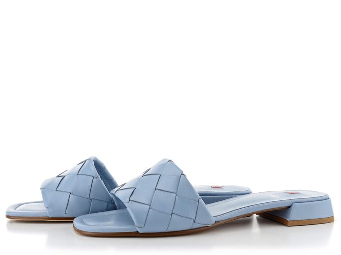 Dámské bledě modré pantofle s páskem z proplétané kůže a s nízkým podpatkem.