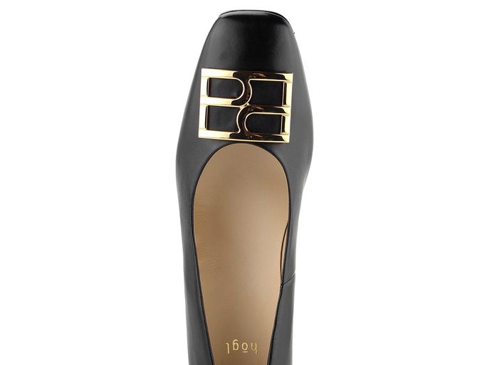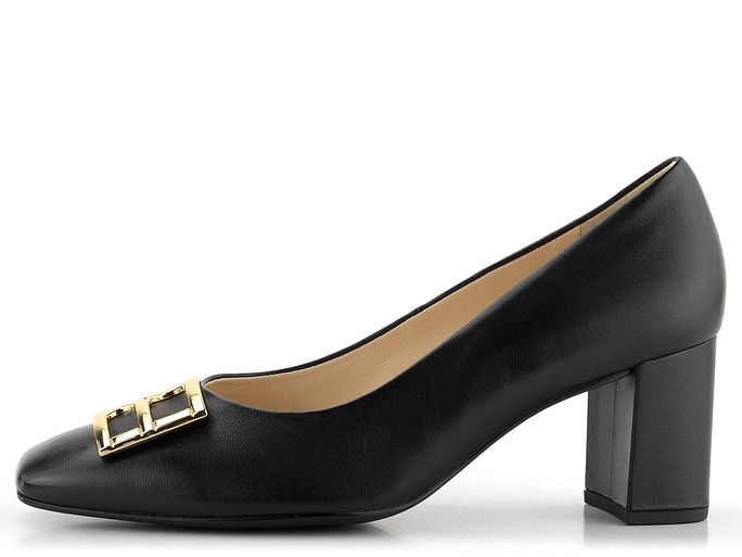 Elegantní dámské lodičky od značky Högl vynikají svým sofistikovaným designem a prémiovou kvalitou. Svršek z hladké kůže v černé barvě je doplněn o kovovou ozdobu ve zlaté barvě, která dodává botám luxusní vzhled. Lodičky mají elegantní karé špičku a široký potažený podpatek o výšce 6,5 cm, který zajišťuje stabilitu a pohodlí při každém kroku. Vnitřní část je celokožená, což zaručuje maximální komfort a prodyšnost. Měkká stélka a vnitřní zabroušený opatek přispívají k celodennímu pohodlí. Hladká podešev a lepený výrobní způsob garantují dlouhou životnost. Tyto lodičky jsou ideální volbou pro formální příležitosti i každodenní nošení do kanceláře.