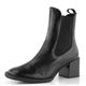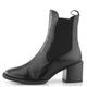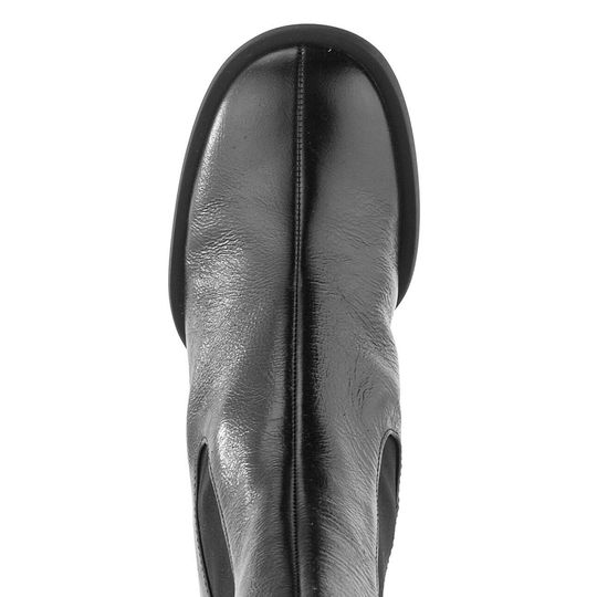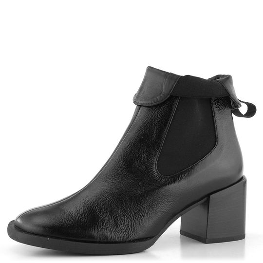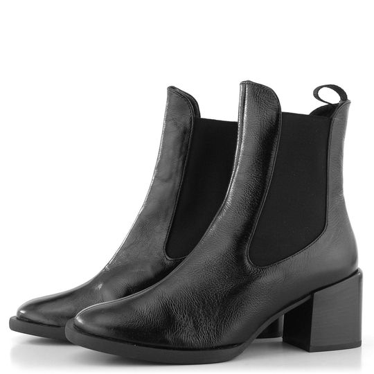 Luxusní dámský kotník bez vnitřního vyteplení z mačkané lakované kůže v černé barvě a s pruženkami po obou stranách.
