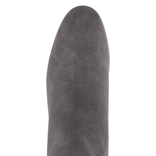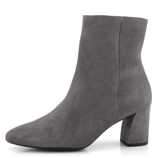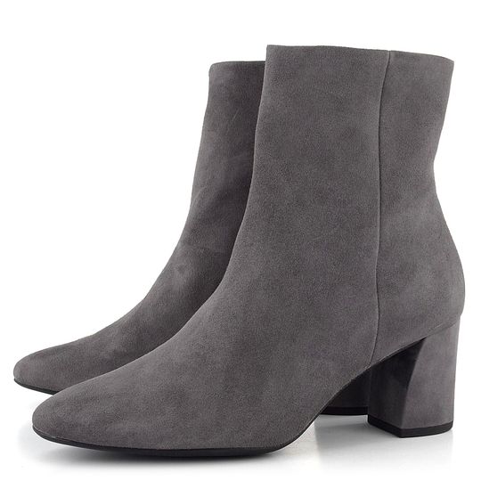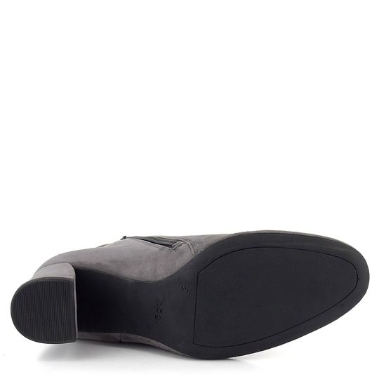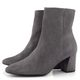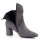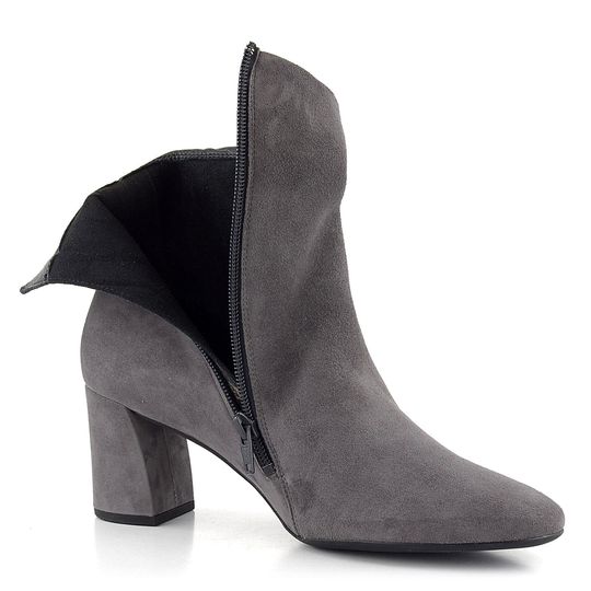 Dámský stylový kotník z šedé velurové kůže, s bočním zipem a potaženým podpatkem.