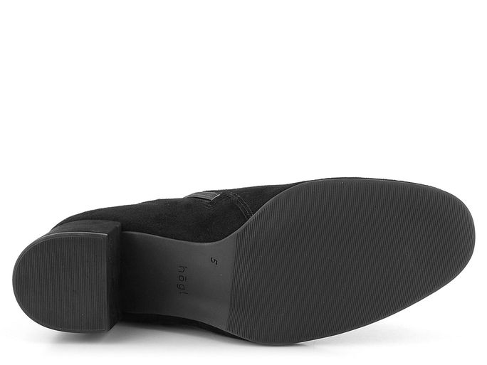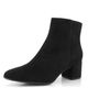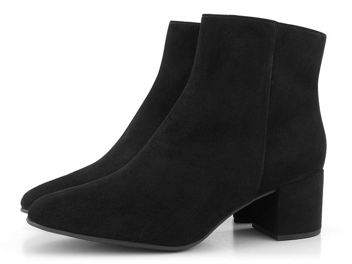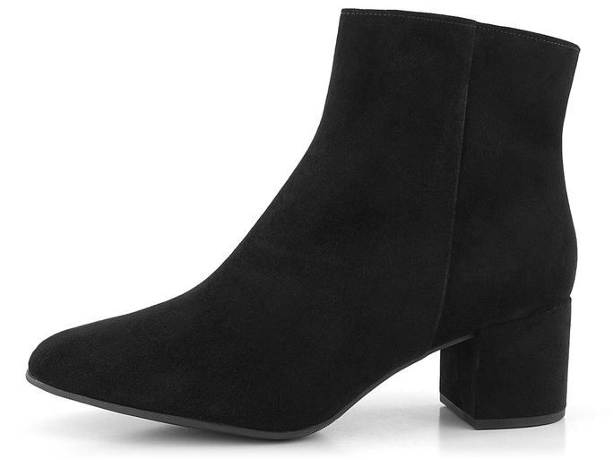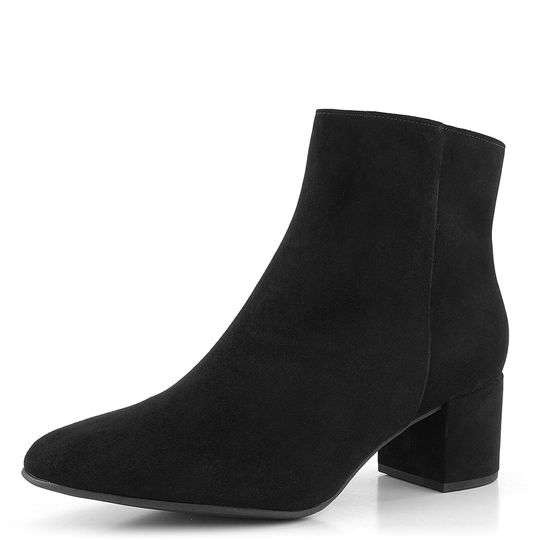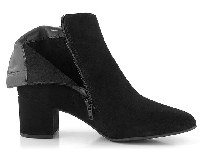 Dámský stylový kotník z černé velurové kůže, s bočním zipem a středně vysokým, potaženým podpatkem.