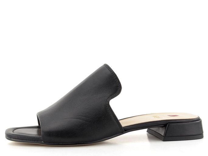 Dámské elegantní pantofle z hladké kůže v černé barvě s vykrojeným páskem.