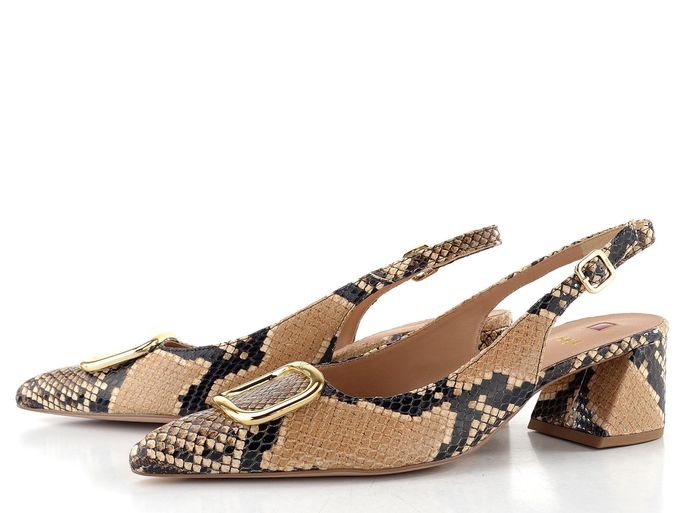Dámské kožené lodičky od značky Högl představují ideální volbu pro jarní a letní dny. Jejich elegantní špičatý střih a nápadný hadinkový vzor z lakované kůže přitahují pozornost a dodávají šmrnc každému outfitu. Kombinace béžových, hnědých a černých odstínů je snadno kombinovatelná, zatímco výrazná pokovená spona ve zlaté barvě na špičce dodává lodičkám na exkluzivitě.