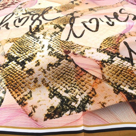 Luxusní hedvábný šátek od rakouské značky Högl je ideálním doplňkem pro jarní a letní sezónu. Tento nádherný šátek je vyroben ze 100 % hedvábí a nabízí jedinečnou kombinaci hadího potisku s jemnými růžovými a béžovými tóny. Ústřední nápis "Högl loves you" dodává šátku osobitý charakter a styl. S rozměry 100 x 100 cm je skvělou volbou pro každou příležitost, ať už se chystáte do kanceláře, na lehkou procházku nebo na formální událost. Tento šátek nejenže skvěle doplní váš outfit, ale také podtrhne vaši osobnost a vkus. Investujte do kvality a elegance s tímto jedinečným kouskem.