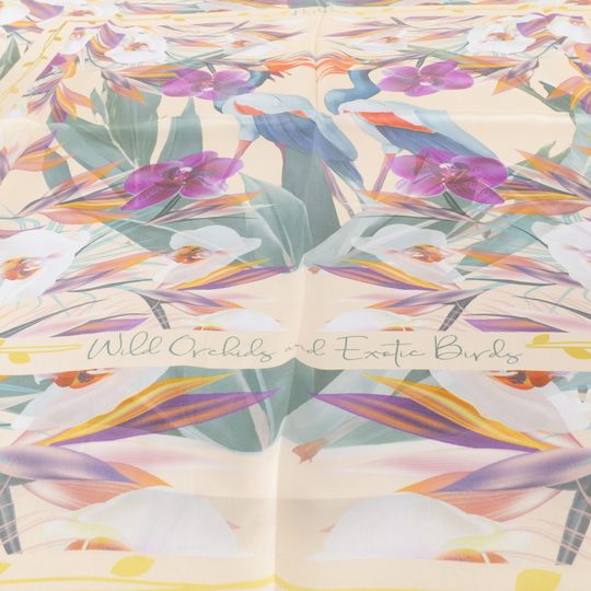 Luxusní hedvábný šátek s motivy tropických květů a ptáků.