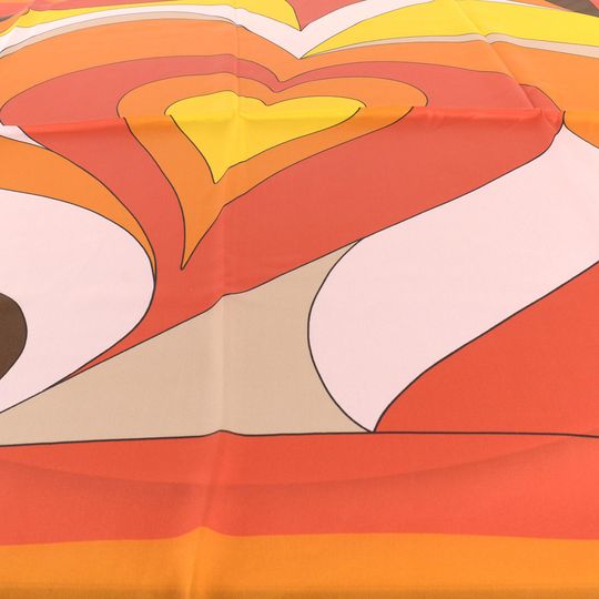 Luxusní hedvábný šátek s motivem srdce v pěkné kombinaci oranžové, červené a žluté barvy.
