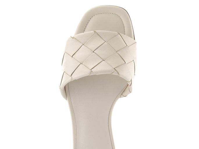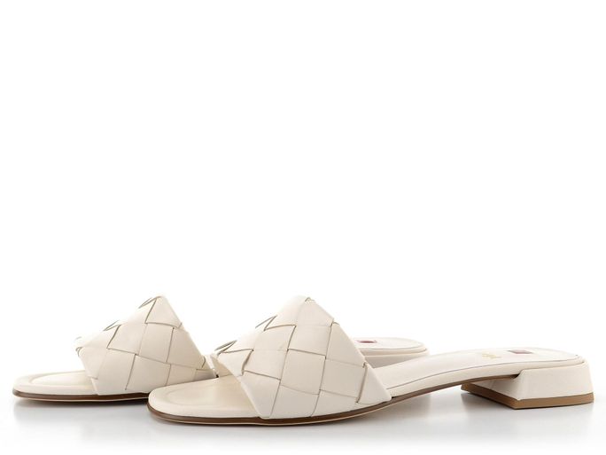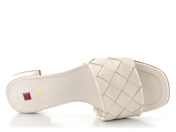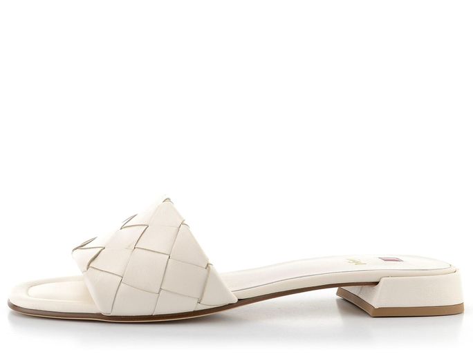 Dámské krémové pantofle s páskem z proplétané kůže a s nízkým podpatkem.