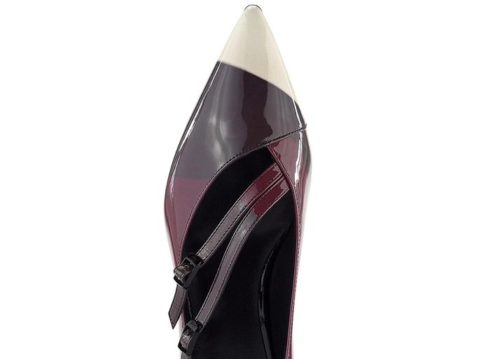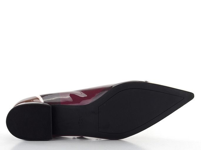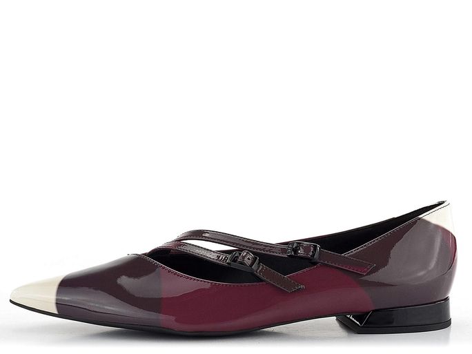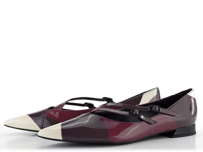 Luxusní dámské špičaté baleríny z lakované kůže ve vícebarevném provedení na nízkém potaženém podpatečku.