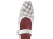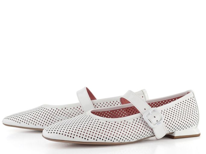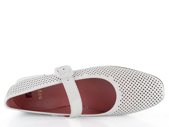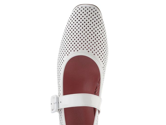 Dámské módní baleríny na nízkém podpatku, v lakované bílé barvě s prořezávaným vzorem na svršku.