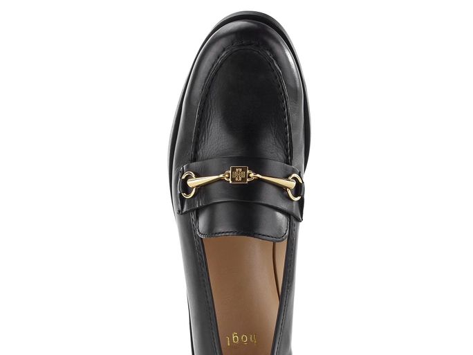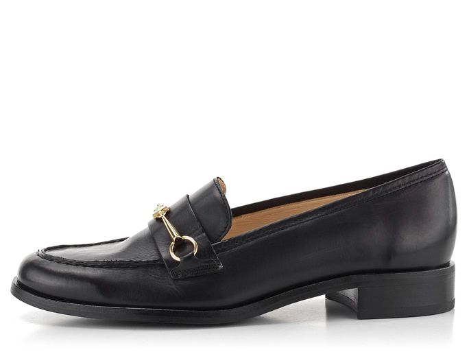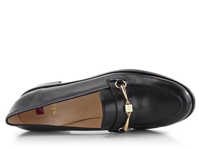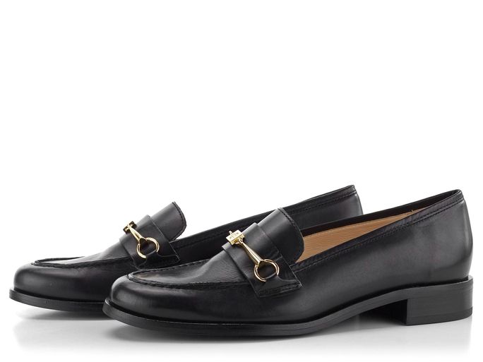 Dámské luxusní mokasíny z jemné leštěné kůže v černé barvě s ozdobným kováním na nártu.