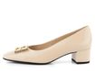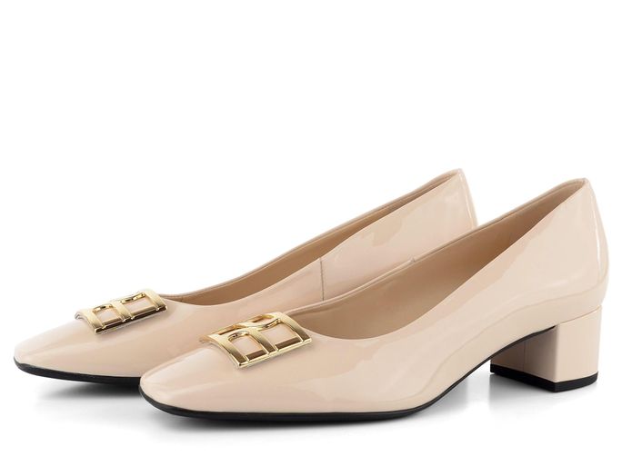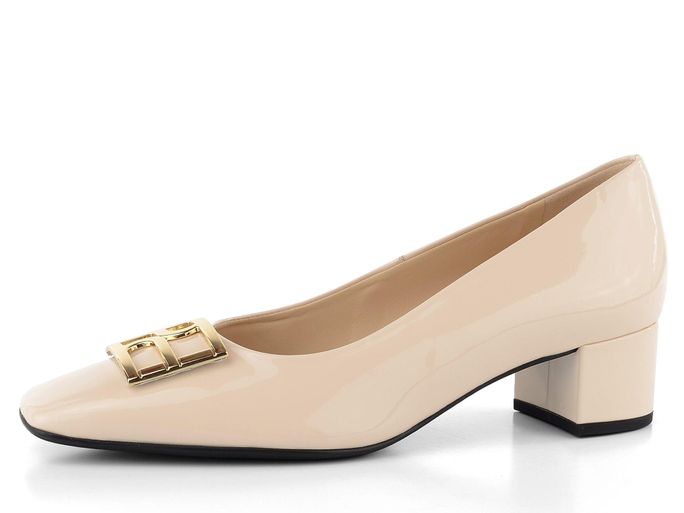Luxusní dámské lodičky s módní karé špičkou vyrobené ze světle krémové lakované kůže.