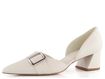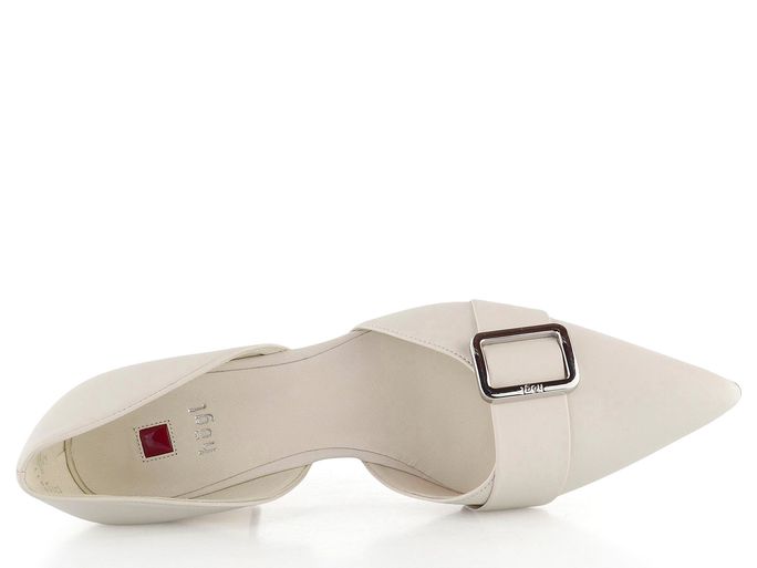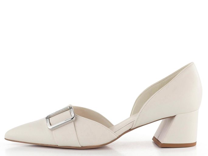 Hladké kožené lodičky ve smetanové barvě, s elegantní úzkou špičkou a zkoseným širokým podpatkem.