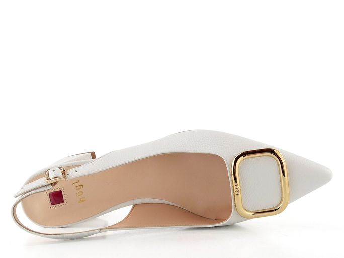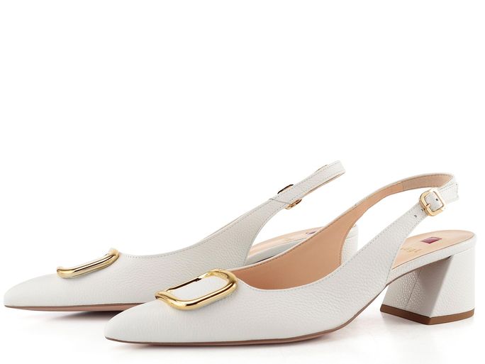 Dámské lodičky od značky Högl spojují eleganci a pohodlí v jednom. Svršek z strukturální kůže v smetanově bílé barvě dodává těmto botám vzdušný vzhled, zatímco špičatý střih a výrazná zlatá spona na špičce přitahují pozornost. Uvnitř najdete celokoženou podšívku a měkkou stélku, které zajišťují komfort po celý den. Patní pásek s délkovou regulací a pruženkou se skvěle přizpůsobí vaší noze. S výškou podpatku 5 cm a hladkou podešví bez vzorku jsou tyto lodičky ideální volbou pro formální příležitosti i každodenní nošení. Vsaďte na kvalitu a styl s Högl.
