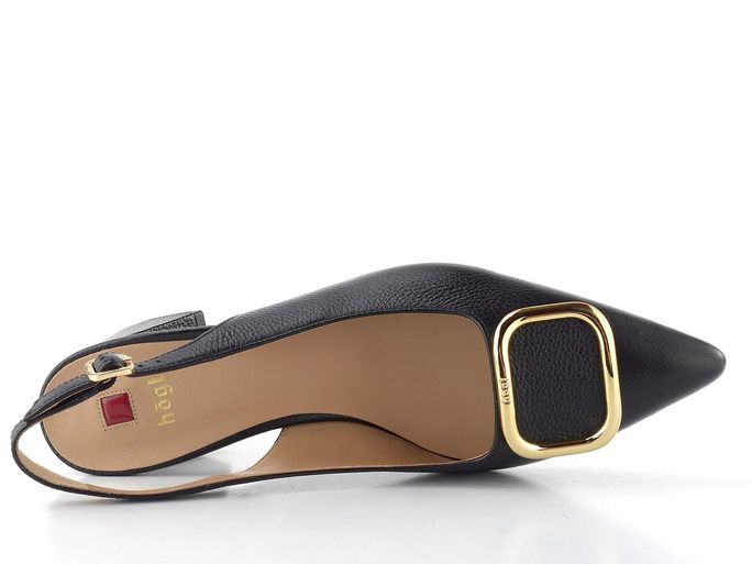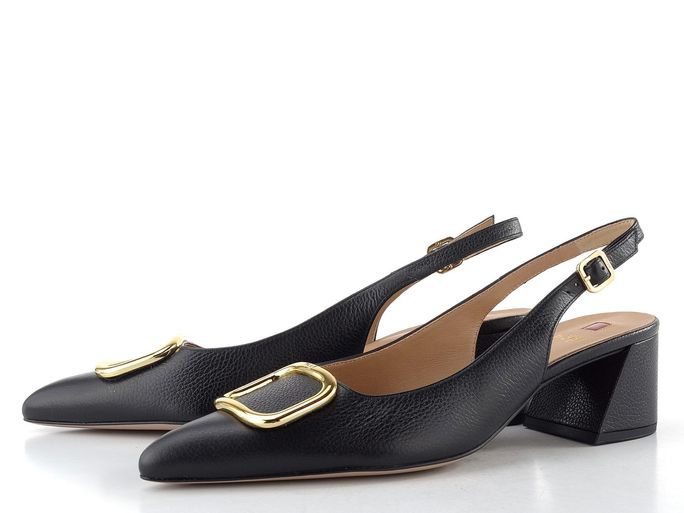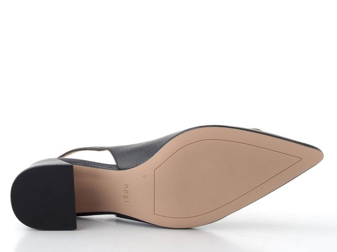 Dámské lodičky s volnou patou od značky Högl jsou ideální volbou pro jarní a letní sezónu. Jejich elegantní špičatý střih v nadčasové černé barvě dodává každému outfitu šmrnc. Svršek z stručkované kůže a celokožená podšívka zaručují vysoký komfort nošení, zatímco příjemně měkká stélka se postará o pohodlí po celý den. Výrazná pokovená spona ve zlaté barvě na špičce přidává na atraktivitě. Patní pásek s délkovou regulací a všitou pruženkou zajišťuje perfektní fit, a to i při chůzi. Široký potažený podpatek o výšce 5,5 cm je pohodlný a stabilní, takže si můžete užít každou chvíli bez obav. Tyto lodičky jsou skvělou volbou pro každou příležitost, kdy chcete vyniknout.
