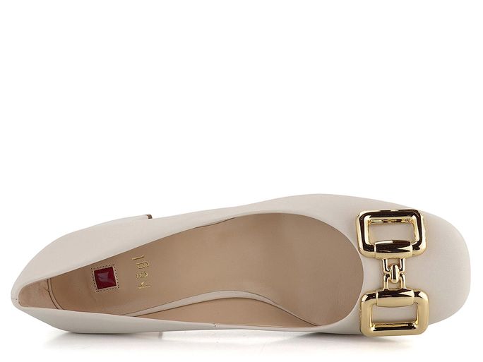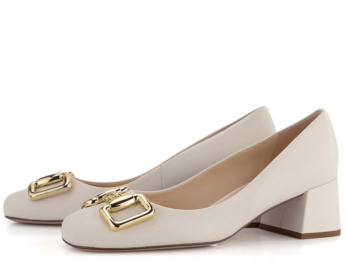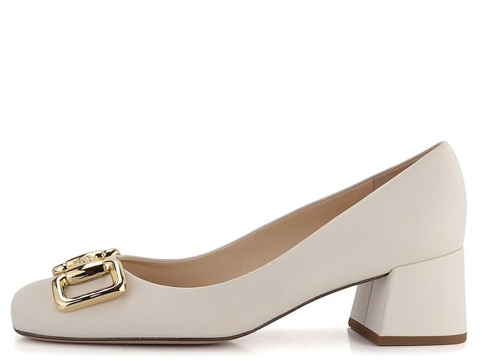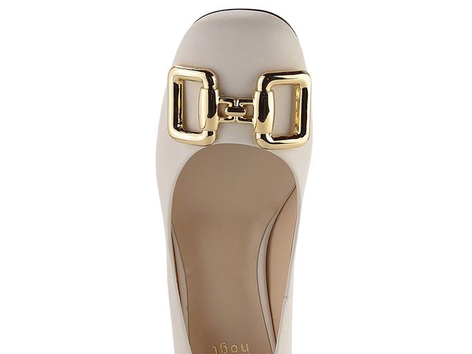 Elegantní dámské lodičky od značky Högl jsou dokonalou volbou pro náročné ženy. Tyto lodičky zaujmou svou hranatější špičkou a hladkou prémiovou kůží v krémovém odstínu, který je velmi světlý a snadno kombinovatelný. Dominantním prvkem je velká kovová spona ve zlatém provedení, která dodává botám luxusní vzhled.