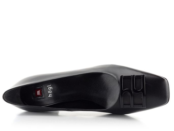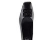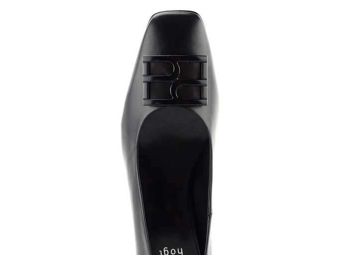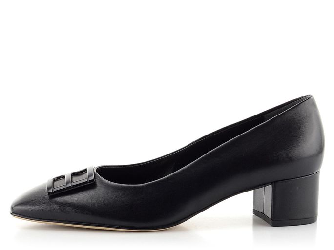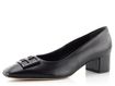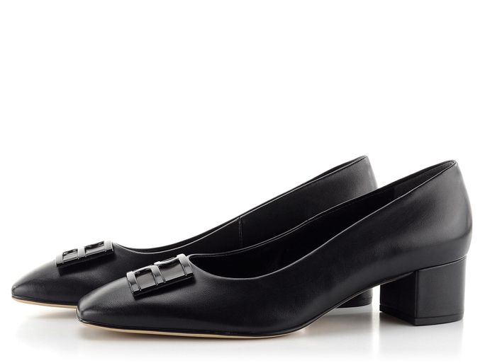Luxusní dámské lodičky v černé barvě s potaženým podpatkem a sponou na špičce.