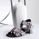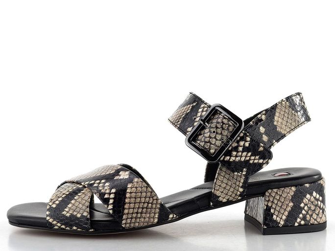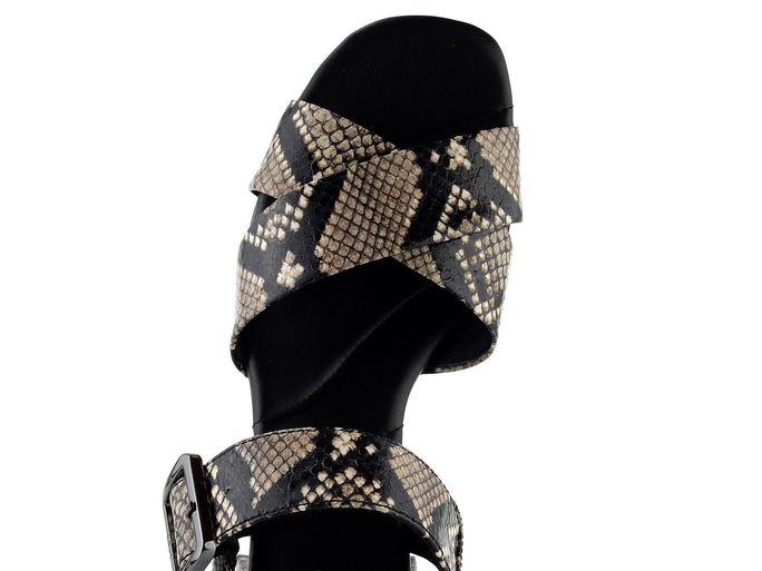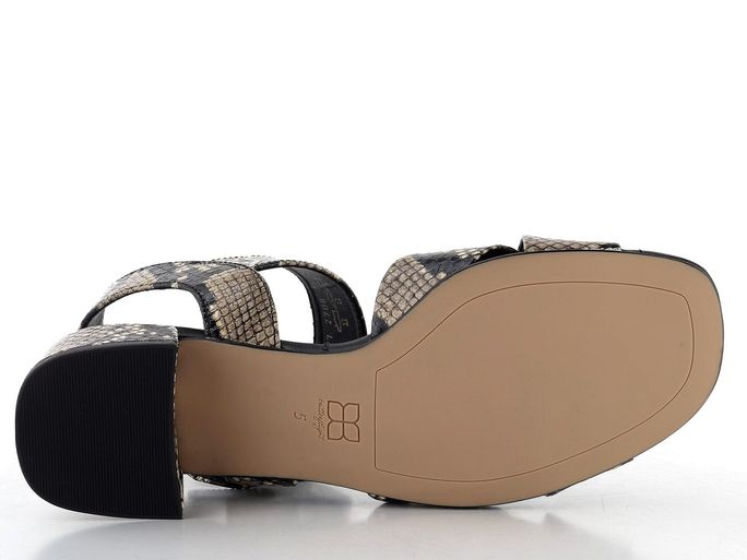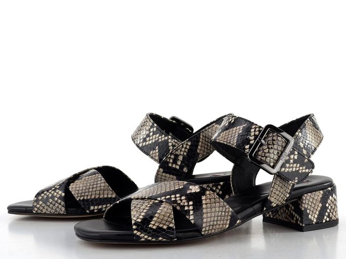 Luxusní dámské sandály s hadinkovým vzorem, širokými pásky a pohodlným stabilním podpatkem.