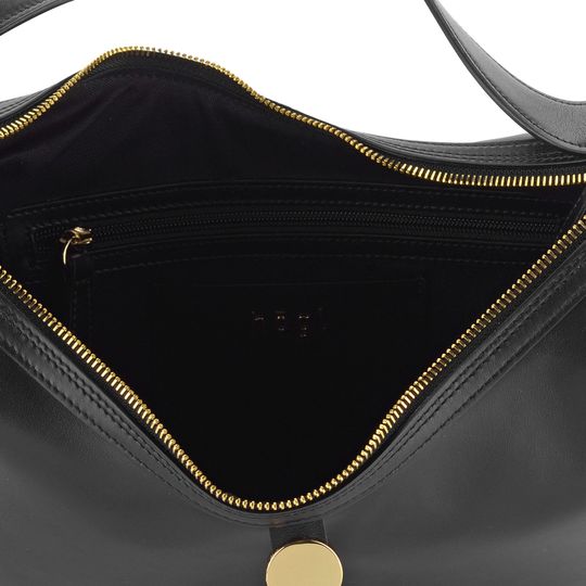 Luxusní dámská kožená kabelka od značky Högl je ideální volbou pro ty, kteří hledají jednoduchý a elegantní design. Tato kabelka zaujme svým trendy střihem gondola a černou barvou, která se hodí ke každému outfitu. Je vyrobena z hladké prémiové kůže, která zaručuje dlouhou životnost a prvotřídní kvalitu. Kabelka má střední velikost, takže formát A4 lze umístit na šířku. Kování ve zlaté barvě dodává kabelce luxusní vzhled. Praktické uzavírání na zip zajišťuje bezpečnost vašich cenností. Vnitřní výbava nabízí dostatek prostoru pro vaše potřeby: 1 zipová kapsička na cennosti, 1 kapsička na zrcátko nebo platební kartu a 2 otevřené kapsičky na mobil či klíče. Ramenní pásek je nastavitelný, což zaručuje pohodlné nošení. Rozměry kabelky jsou: horní šíře 34 cm, šíře uprostřed 37 cm, výška uprostřed 25 cm a hloubka dna 8 cm. Tato kabelka je ideálním doplňkem pro podzimní a zimní sezónu 2024/25.