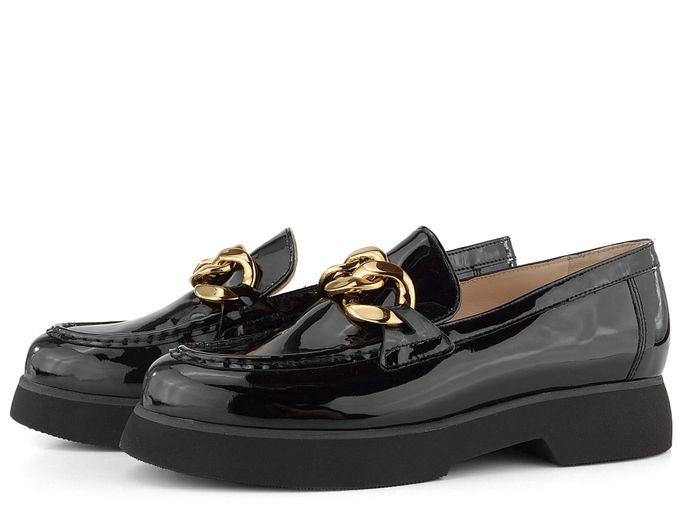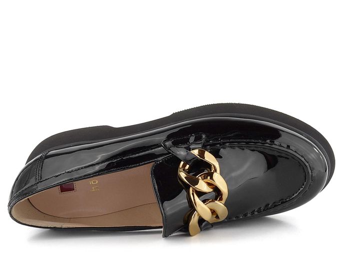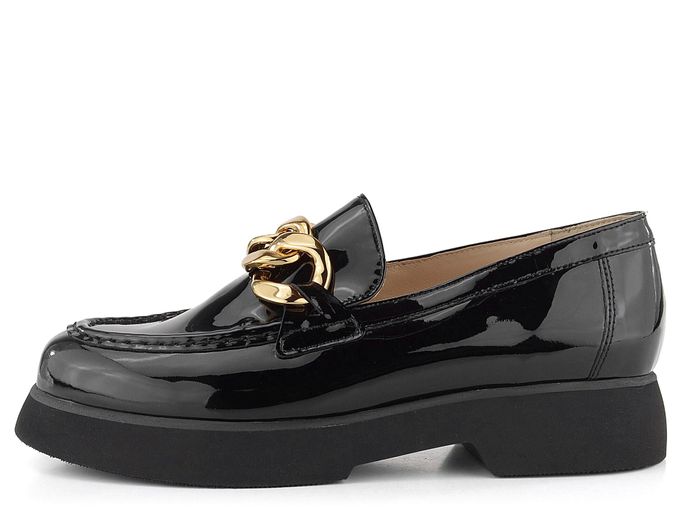 Elegantní dámské mokasíny od značky Högl jsou ideální volbou pro podzimní a zimní sezónu. Tyto boty zaujmou svým módním mokasínovým stylem s kulatou špičkou a prémiovou hladkou kůží v lakované úpravě. Černá barva dodává botám nadčasový vzhled, který je umocněn nártem ozdobeným kovovým řetízkem ve zlaté barvě. Uvnitř najdete celokoženou podšívku, která je příjemně poddajná a měkkou koženou stélku pro maximální komfort. Semišový vyztužený opatek a vysoká platforma s nízkým 3,5 cm podpatkem zajišťují stabilitu a pohodlí při každém kroku. Tyto mokasíny jsou vyrobeny lepeným výrobním způsobem, což přispívá k jejich trvanlivosti. Poznámka: při nošení obuvi může dojít k přirozenému zvrásnění materiálu v namáhaných místech, což je typická vlastnost materiálu, nikoliv jeho vada. Vyberte si kvalitu, která vydrží a dodá vašemu outfitu šmrnc.
