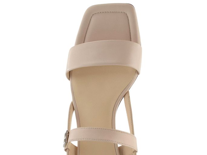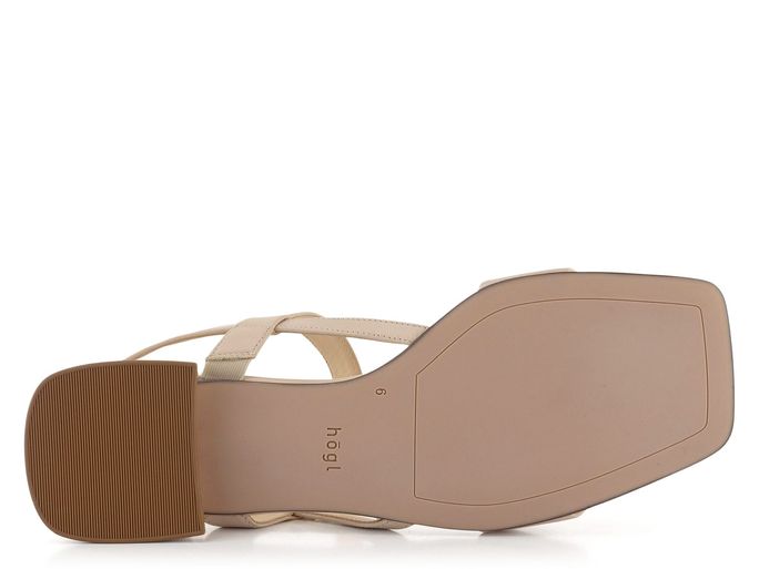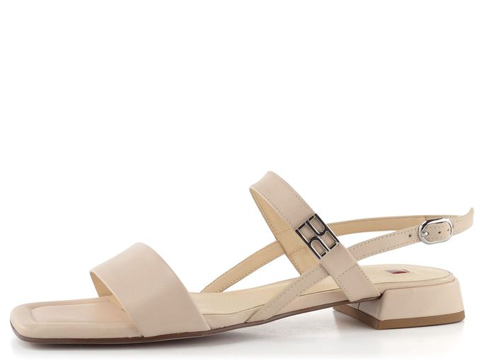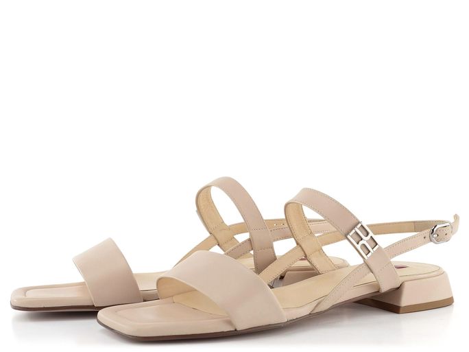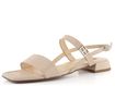 Dámské sandály ve světle béžové barvě s nastavitelným patním páskem a nízkým podpatkem.