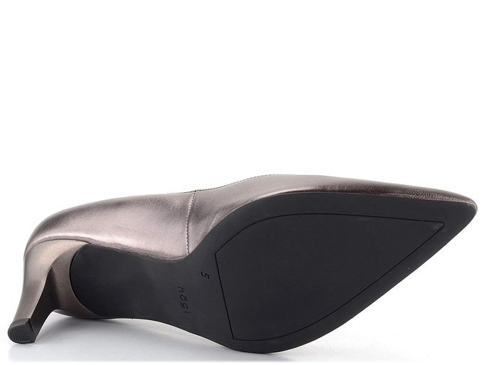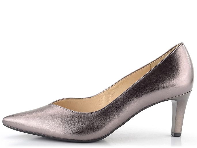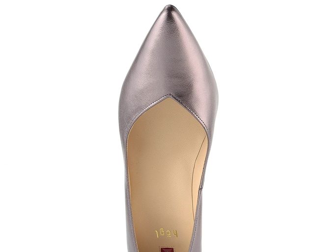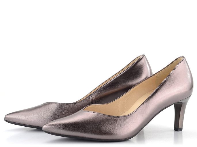 Luxusní a velmi elegantní metalické lodičky od značky Högl jsou ideální volbou pro podzimní a zimní sezónu. Tyto lodičky se pyšní módním a elegantním špičatým střihem a svrškem z metalické kůže v tmavém bronzovém odstínu. Zajímavý prostřih na nártu ve tvaru písmene "V" dodává botám jedinečný vzhled. Uvnitř najdete poddajnou celokoženou podšívku a příjemně měkkou stélku, která zajišťuje maximální komfort. Lodičky mají štíhlý, středně vysoký podpatek o výšce 6,5 cm, který je ve stejném barevném tónu jako svršek. Hladká podešev a lepený výrobní způsob garantují kvalitu a trvanlivost. Tyto lodičky jsou perfektní volbou pro formální příležitosti i každodenní nošení do kanceláře.