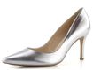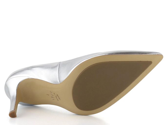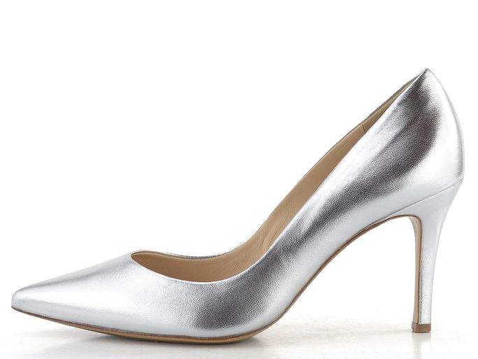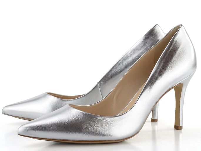 Elegantní dámské kožené lodičky ve stříbrné barvě, s koženou podešví a vysokým jehlovým podpatkem.
