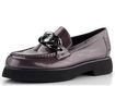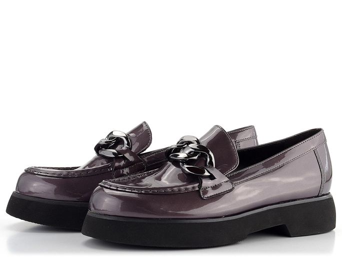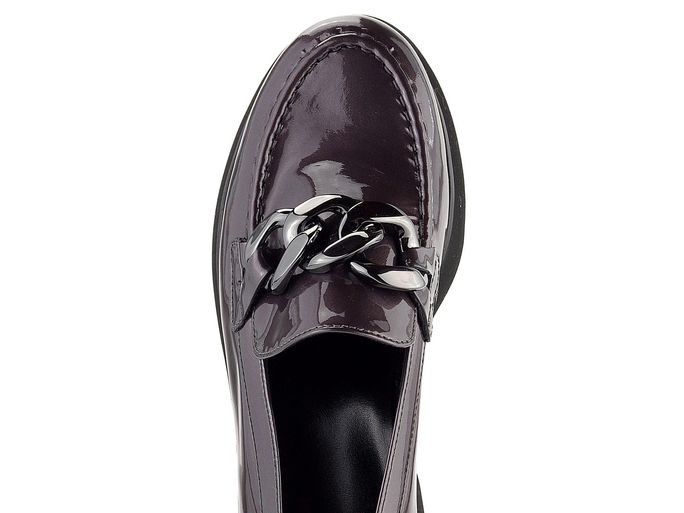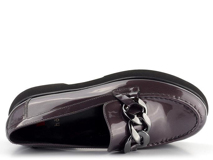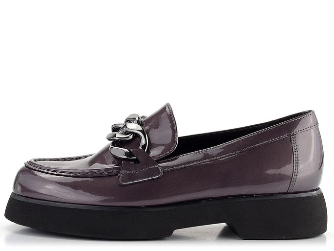 Elegantní dámské mokasíny na vysoké podešvi od značky Högl představují ideální spojení stylu a komfortu. Tyto mokasíny vynikají hladkou metalickou kůží v lakované úpravě a nevšedním odstínem kovově šedofialové barvy (odstín gun). Nárt zdobí kovový řetízek v tmavé, ocelově šedé barvě, což dodává botám jedinečný vzhled. Uvnitř se nachází celokožená podšívka, která je příjemně měkká a poddajná. Mokasíny mají semišový vyztužený opatek a vysokou platformu se širokým podpatkem o výšce 3,5 cm. Tento model je ideální pro podzimní a zimní sezónu, kdy chcete vypadat stylově a zároveň se cítit pohodlně. Lepený výrobní způsob zajišťuje vysokou kvalitu a trvanlivost. Při nošení může dojít k přirozenému zvrásnění materiálu, což je typická vlastnost kůže a nikoliv vada.