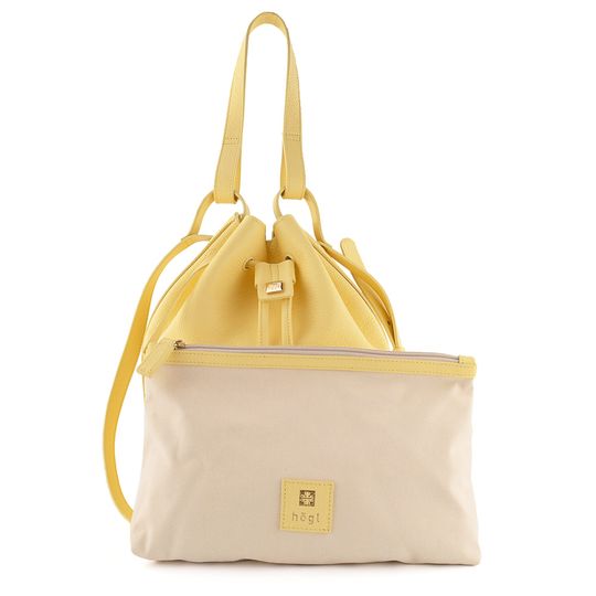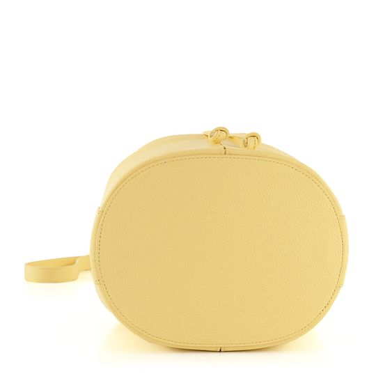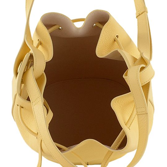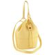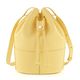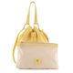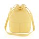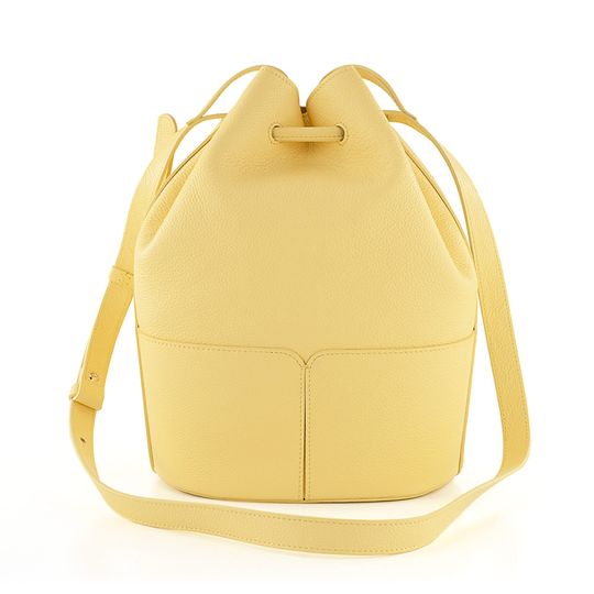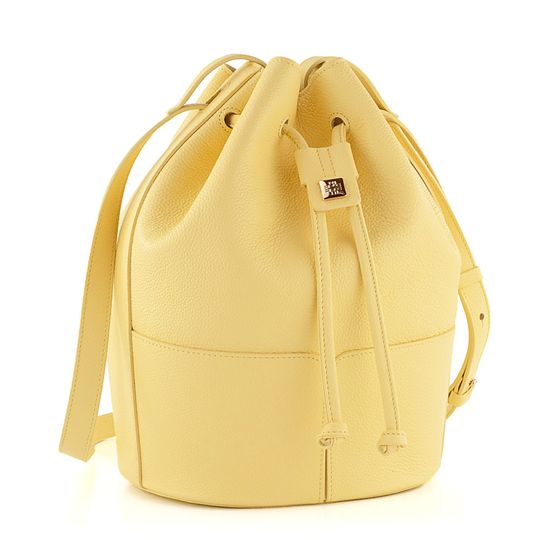 Luxusní dámská kabelka ve tvaru vaku, vyrobena ze strukturované kůže ve světle žluté barvě, s vnitřní etuí na cennosti.