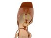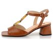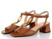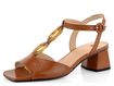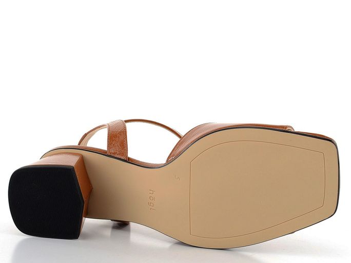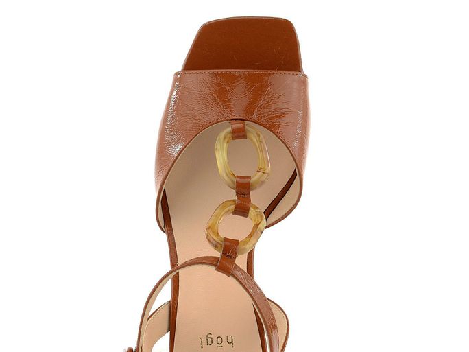 Dámské lakované sandály v hnědé barvě na středně vysokém, stabilním podpatku.