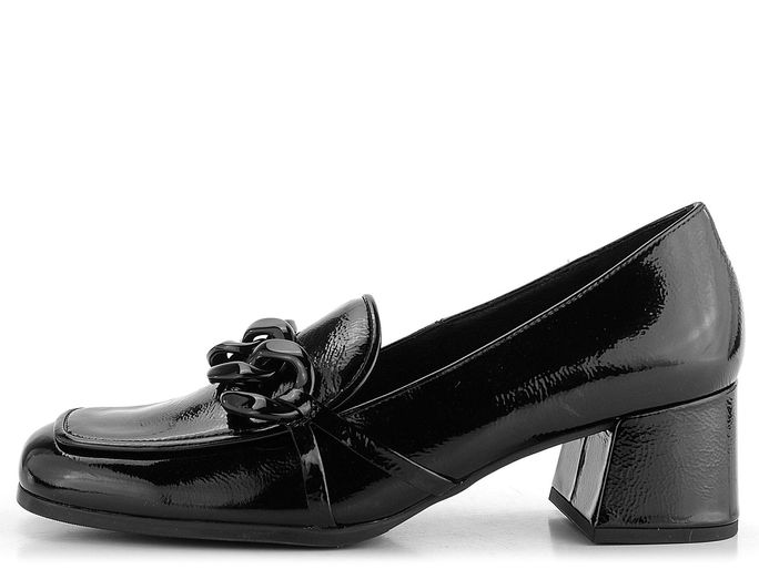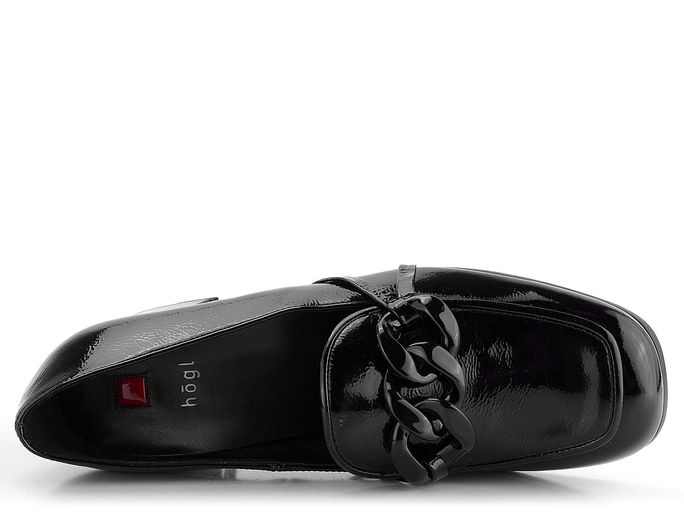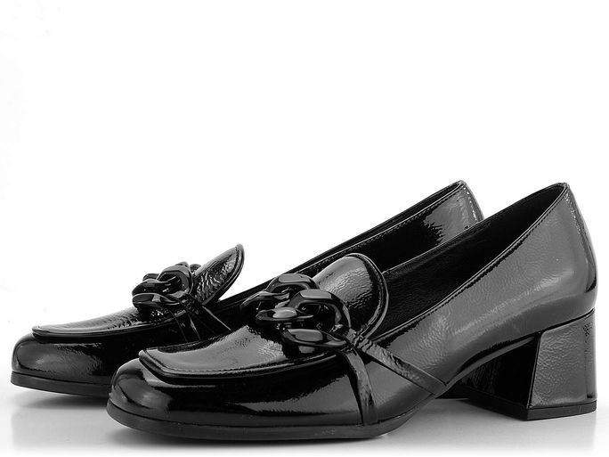 Dámské mokasíny na podpatku od značky Högl přinášejí do vašeho šatníku eleganci a komfort. Tyto módní polobotky jsou vyrobeny z lakované kůže s lehkým mačkaným efektem, což jim dodává unikátní vzhled. Elegantní černá barva a karé špička podtrhují jejich sofistikovaný styl. Na nártu je umístěn výrazný kovový řetěz v černém lakovaném provedení, který dodává botám moderní akcent.